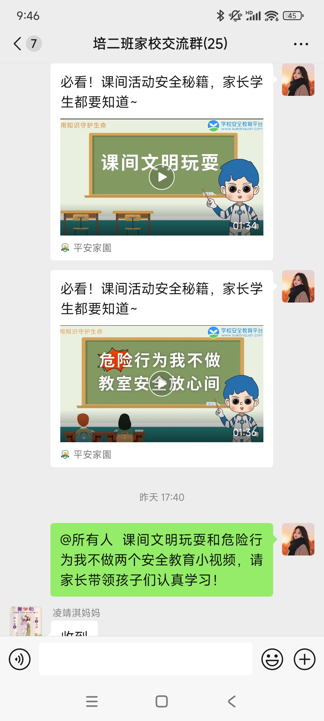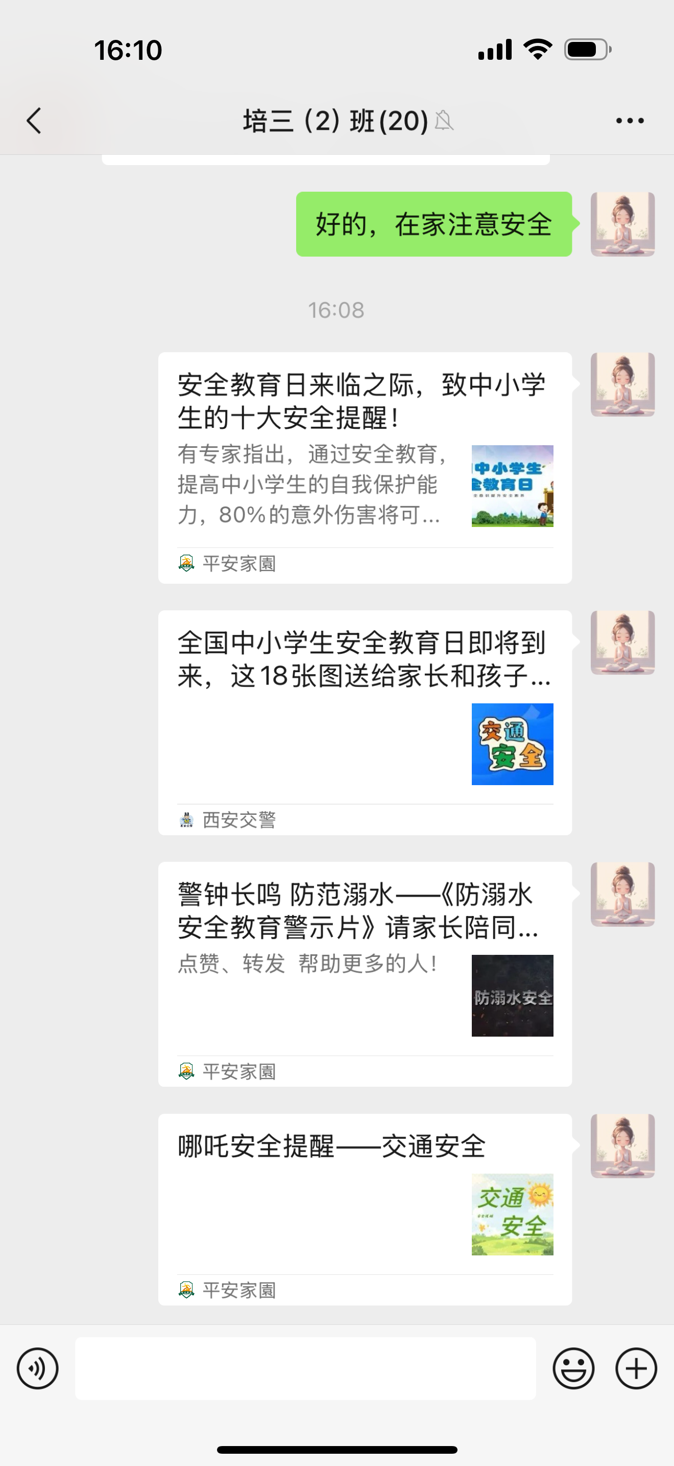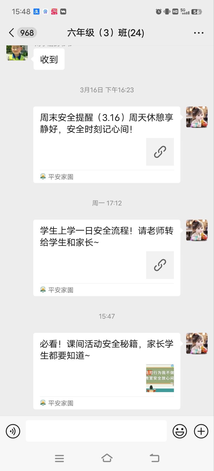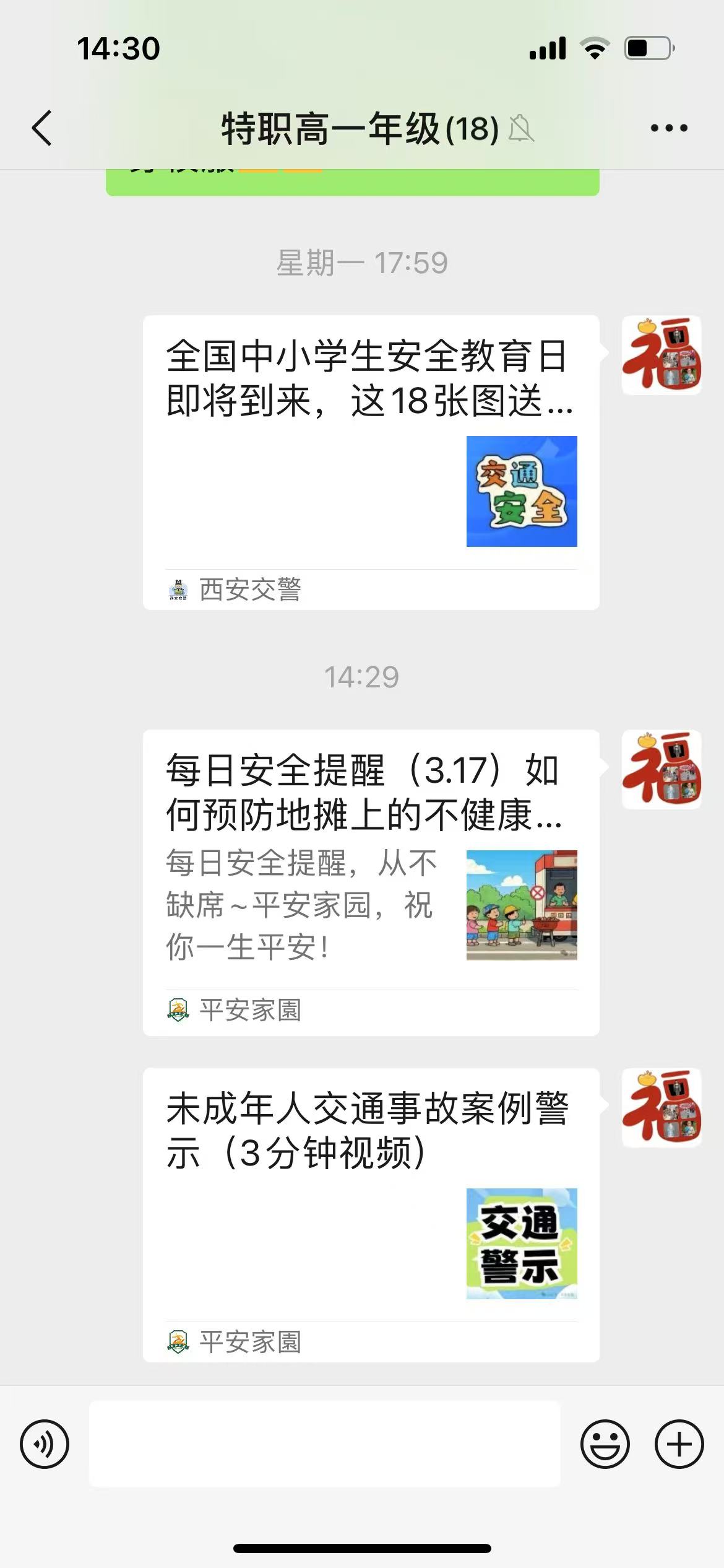 利用班级群这一便捷的沟通平台,学校向家长们推送安全教育日相关内容。包括安全知识科普文章、安全事故案例分析、学生在校参加安全教育活动的照片和视频等,让家长及时了解学校安全教育动态,掌握更多安全教育方法。鼓励家长在日常生活中加强对孩子的安全教育和监管,形成家校教育合力,共同为学生的安全保驾护航。