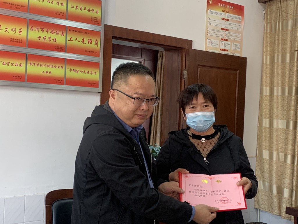 会议首先汇报了学校安全教育、疫情防控相关情况,倡导家委会成员做安全示范人,以身作则,关注学生的交通安全、防溺水教育、心理健康,协助学校常规管理工作,接着商讨了学生校服购买方案,最后由常建文校长为家委会成员颁布聘书。